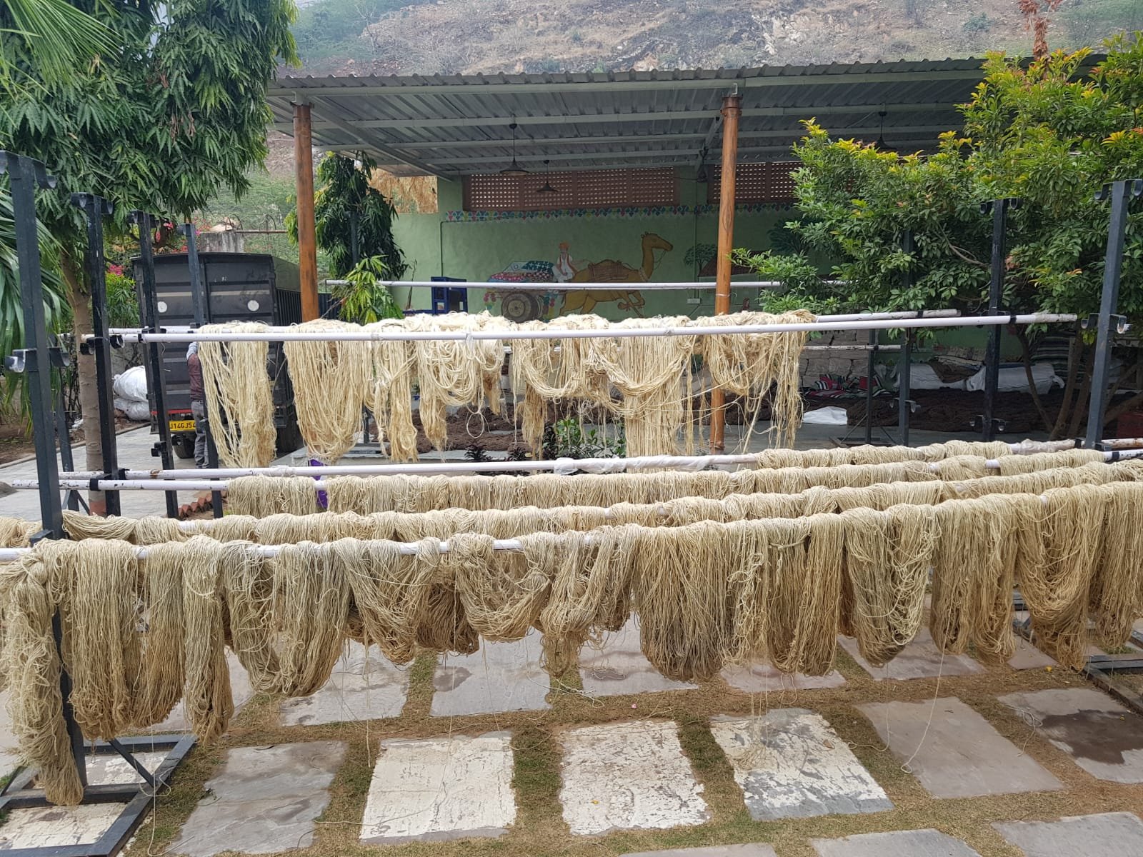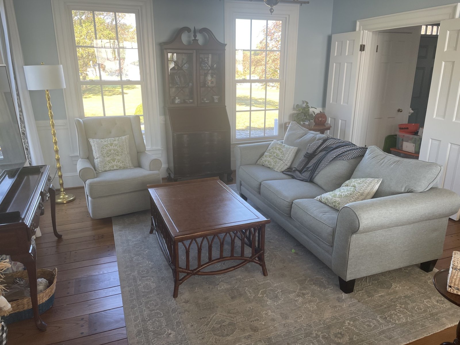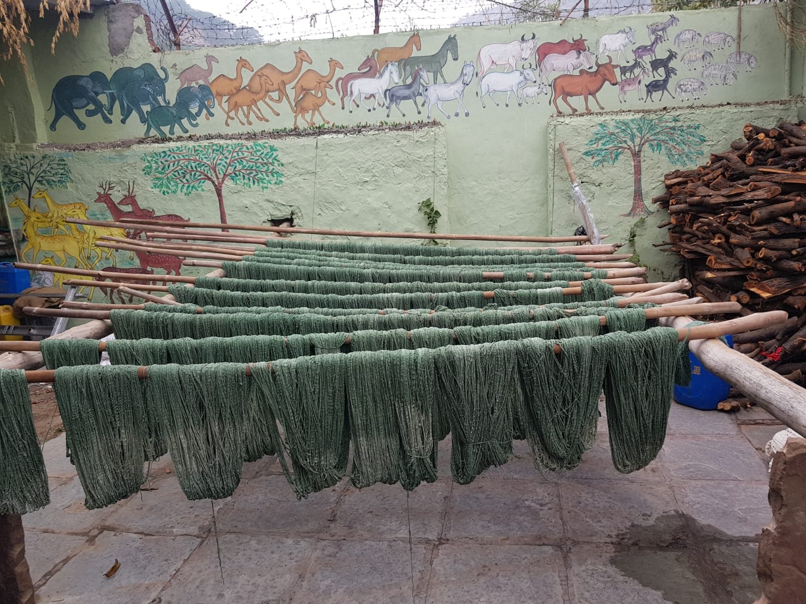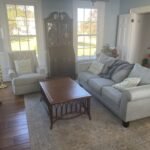 Browse the photos below to see this Suffolk, Virginia living room (a) before the dhurrie rug, (b, c) photos of the yarn before and after being dyed, (d) the hand-weaving process that goes into making a rug on a traditional loom, and (e, f) the room on the day the rug was brought home, unfolded, and added a bright, cheerful, uplifting ambience to the family living space.